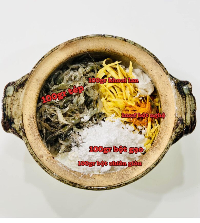 - Trộn bột mì với bột chiên giòn, bột nghệ, tép, khoai lang bào sợi.