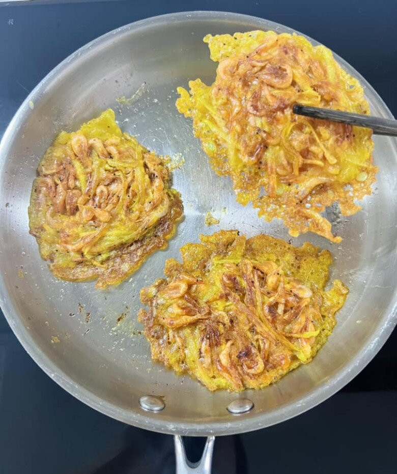 Làm nóng chảo. Lưu ý, nếu dùng chảo inox thì chảo Inox phải nóng đủ nhiệt thì chiên mới không bị dính. Các bạn có thể kiểm tra nhiệt của chảo đạt chưa bằng cách vẩy nước vào, thấy nước tròn xoe chạy xunh quanh chảo là được rồi. Chảo nóng, thêm dầu, đợi dầu nóng, múc muỗng hỗn hợp bột đã pha cho vào chảo chiên chín vàng 2 mặt được.