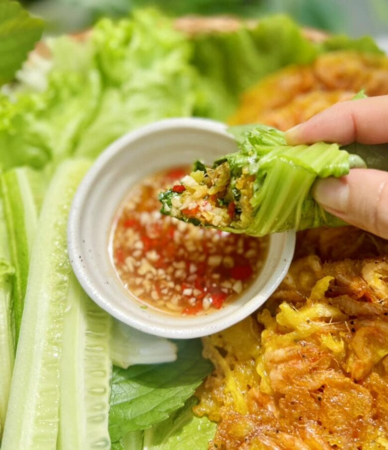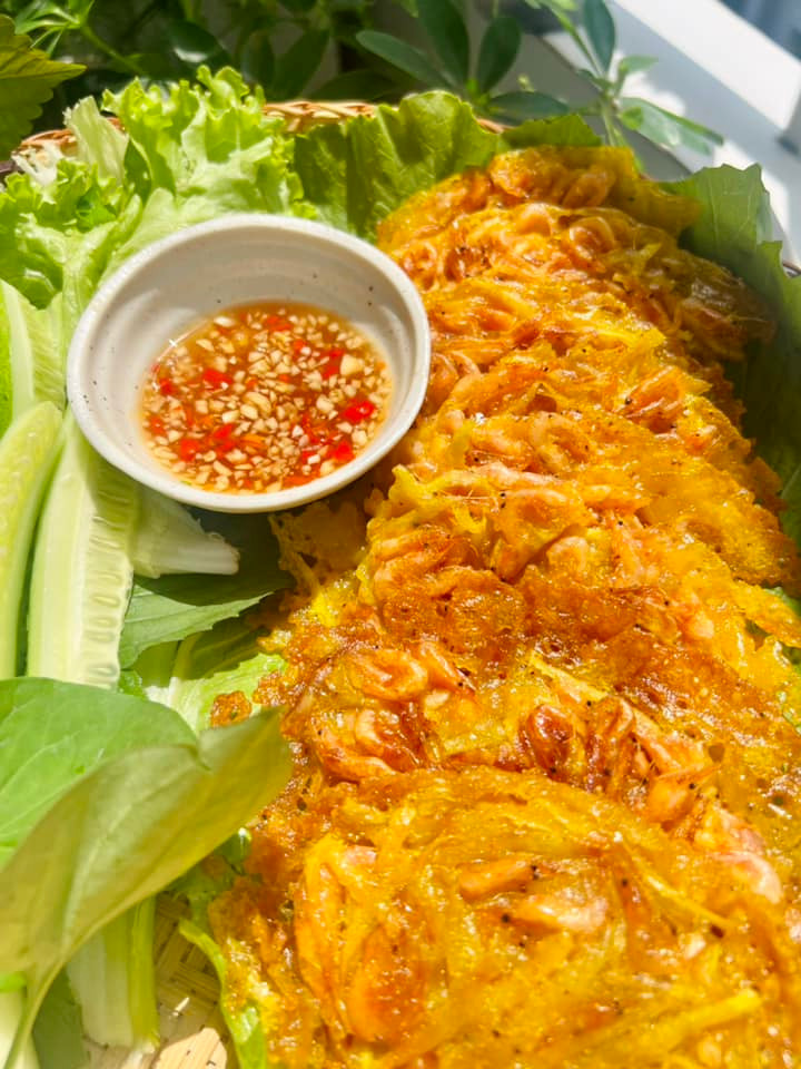 Khi ăn, cuốn bánh tép khoai lang với rau sống rồi chấm nước chấm chua ngọt nhé. Bánh giòn tan, thơm nức, ăn ngon vô cùng.