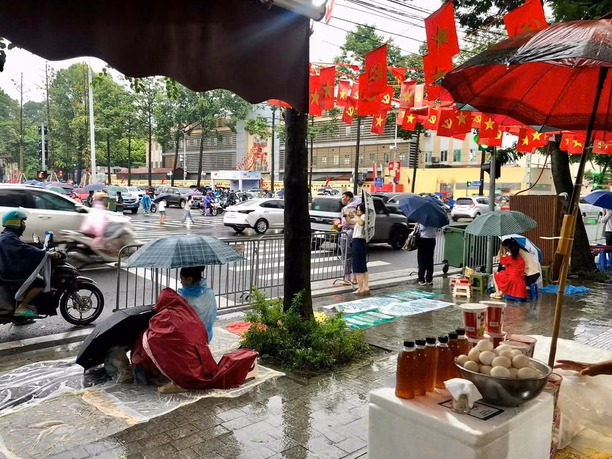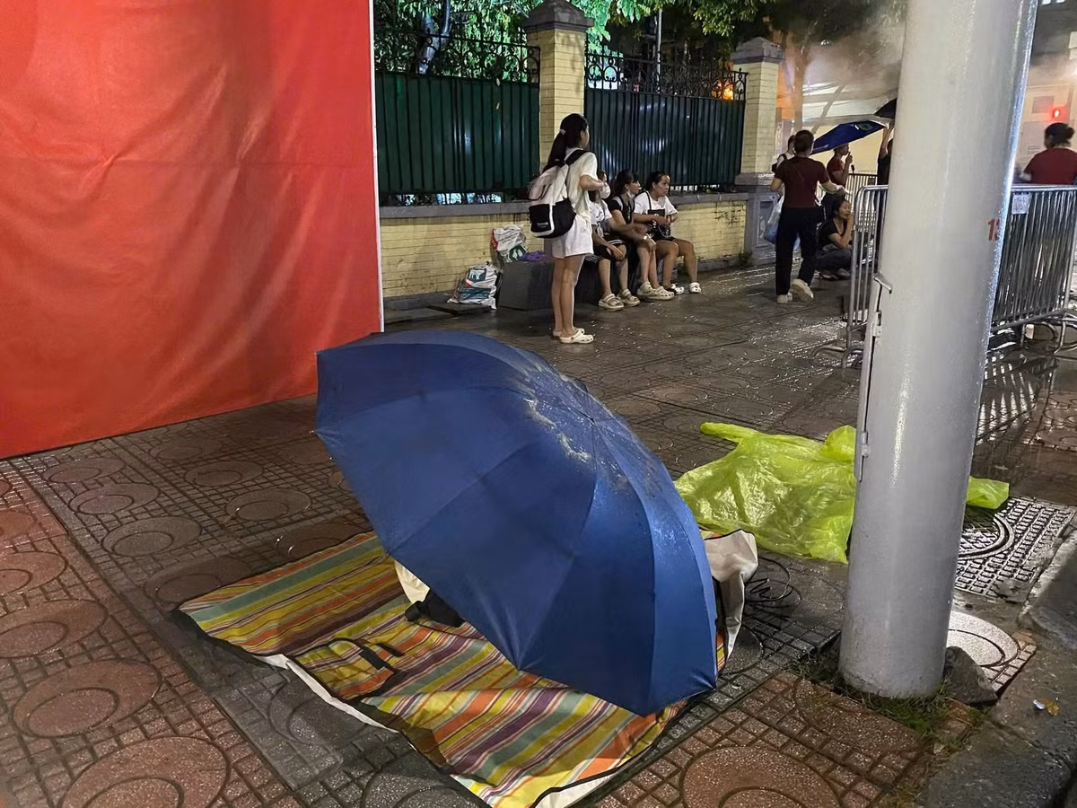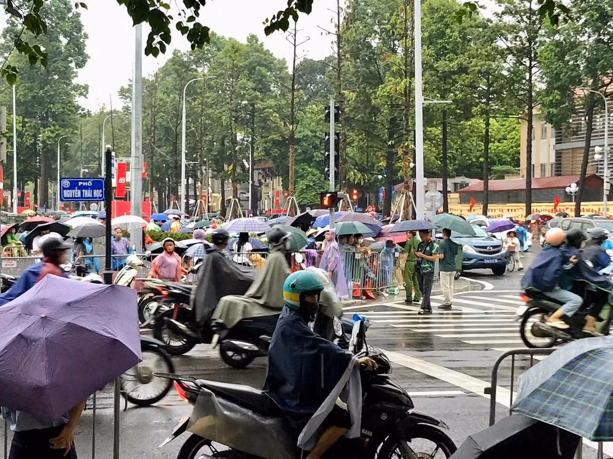 Từ tối 26/8 tại ngã tư Trần Phú - Hùng Vương, rất nhiều người dân đã dựng lều, che ô ngồi giữ chỗ để xem sơ duyệt diễu binh A80, mặc trời đang mưa lớn.