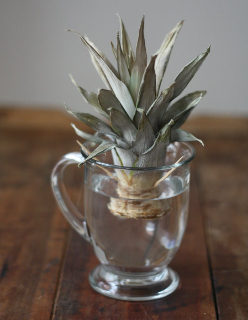 Bước 1: Trước tiên, vặn phần thân lá ra khỏi quả dứa, chú ý vặn khéo không để gẫy giữa thân cây. Dùng dao cắt bỏ phần đế vừa cắt từ thân lá và bóc một vài lá dứa ở đầu vết cắt.