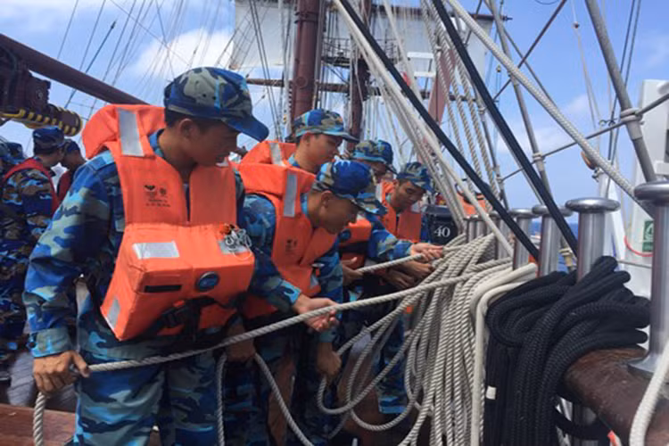 Cán bộ, giảng viên Học viện Hải quân hướng dẫn các học viên thực hiện các kỹ thuật thao tác dây buồm.