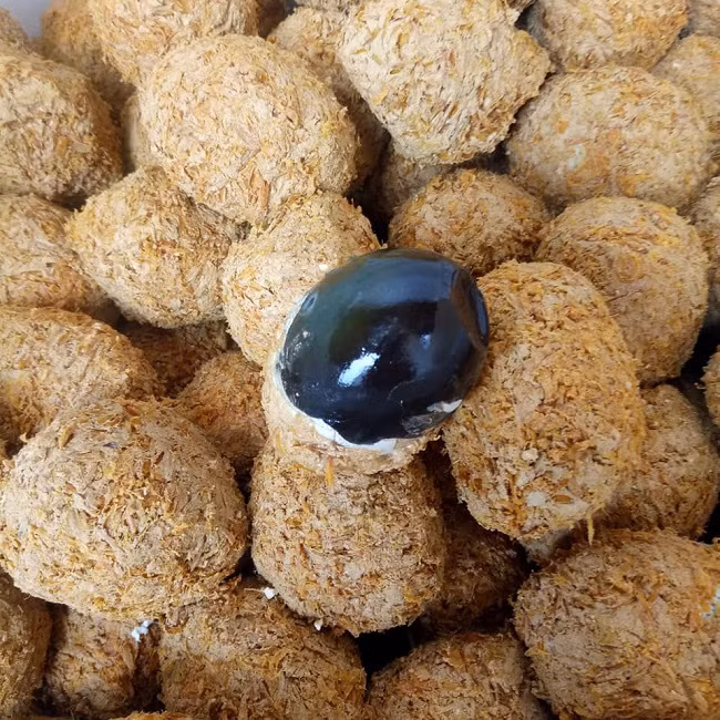 Sau lớp vỏ trứng là lớp lòng trắng màu đen, xanh đen, nâu đen dạng thạch đặc biệt.