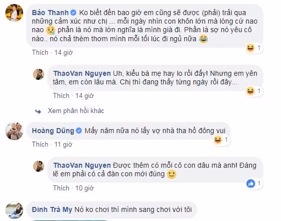 Diễn viên Bảo Thanh để lại dòng bình luận phía dưới status của MC Thảo Vân: "Không biết đến bao giờ em cũng sẽ được (phải) trải qua những cảm xúc như chị. Mỗi ngày nhìn con khôn lớn mà lòng cứ nao nao. Phần là nó mà lớn nghĩa là mình già đi. Phần là sợ nó yêu cô nào, nó chả thèm thơm mình mỗi tối lúc đi ngủ nữa". Nghệ sĩ Hoàng Dũng và Đinh Trà My cũng bình luận động viên MC Thảo Vân.