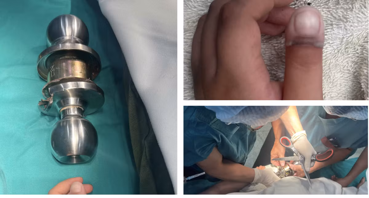 Theo Bệnh viện Chấn thương Chỉnh hình TP HCM, chiều ngày 18/12, bé trai (5 tuổi) nghịch ngợm tự đưa tay vào ổ khóa và bị kẹt ngón cái tay trái vào ổ khóa tại nhà.