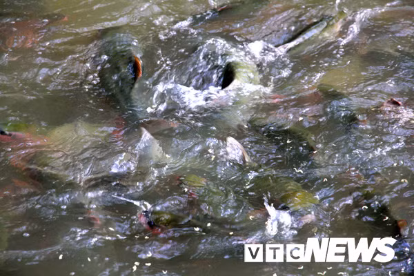 | Bà Lường Thị Khoán cho "cá thần" ăn. |