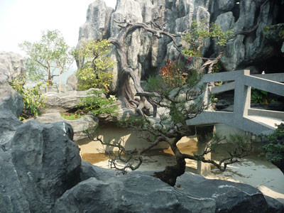 Vào bên trong, bức tượng Quan âm cao hơn 6 m và bức tượng Phật Di Lặc cao hơn 4m được tạc bằng đá quý tựa lưng vào ngọn núi đá nhân tạo đẹp mắt. Ngoài ra, còn có 2 con rồng cũng được làm từ đá quý uốn lượn sau lưng bức tượng.