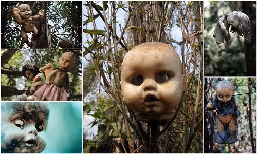 Giữa các kênh rạch chằng chịt, hòn đảo này đang là ngôi nhà của hàng nghìn con búp bê mất đầu, mất chân tay, mắt trống hoác treo lủng lẳng trên những cành cây, bờ giậu và trải đầy trên mặt đất.