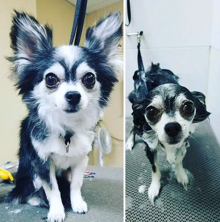Lúc chưa tắm, nhìn những chú thú cưng bông xù đáng yêu với những sợi lông dài. Nhưng khi xả nước xong trông chúng tội nghiệp.