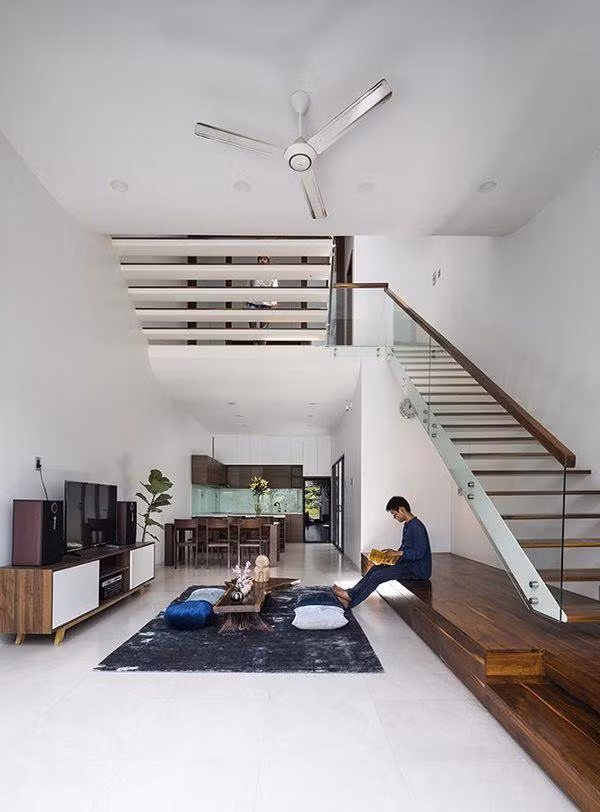 Chính vì thế, các kiến trúc sư đã thiết kế một ngôi nhà lệch tầng, có 2 khoảng thông tầng ở trước và giữa nhà. Nhờ đó, căn nhà có nhiều khoảng hở, các phòng liên thông với nhau một cách dễ dàng.