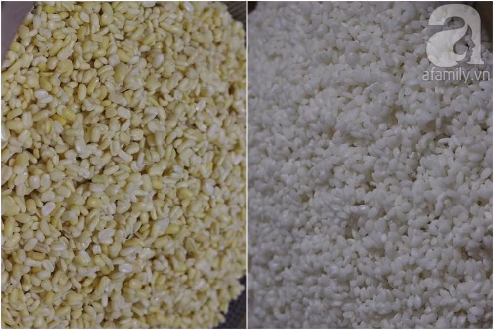 Gạo nếp và đậu xanh vo sạch, ngâm với nước trong khoảng 5 – 6 giờ đồng hồ. Sau đó, đổ gạo và đậu xanh ra rổ cho ráo nước.