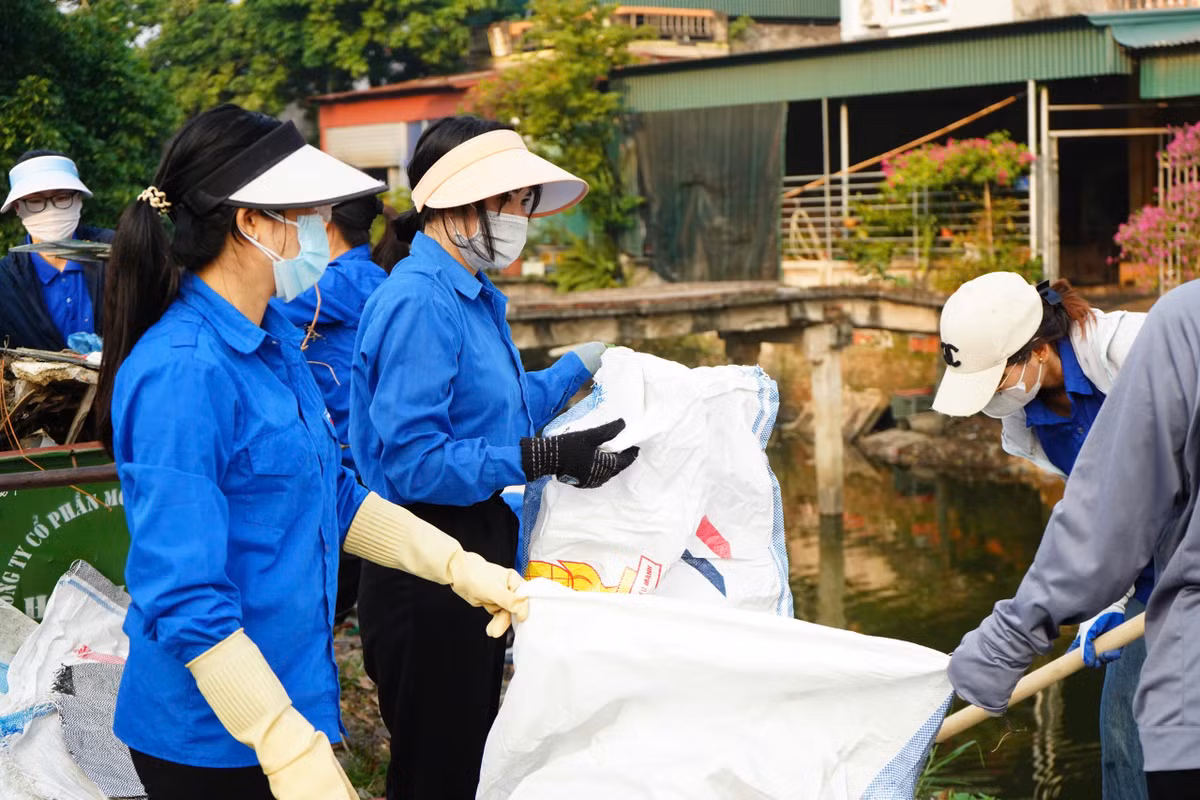 Người dân tham gia dọn vệ sinh tại kênh Thạch Khôi.
