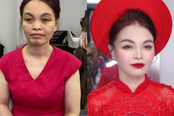 Trước đó, người dùng mạng xã hội cũng rất bất ngờ với màn biến hoá của một cô dâu U40. Chỉ nhờ make up, cô đã như quay trở lại thời đôi mươi trẻ trung, xinh đẹp. Ban đầu, khi chưa được tạo hình, người phụ nữ đã để lộ làn da với nhiều khuyết điểm.