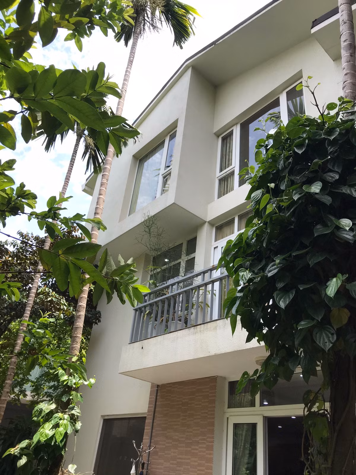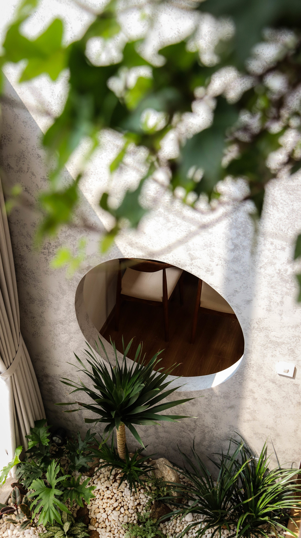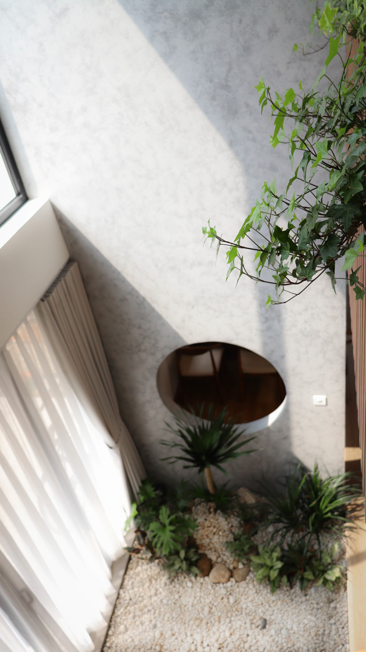Ban đầu biệt thự có 2 tầng kín. Tuy nhiên, đội ngũ kiến trúc sư đã nghĩ ra ý tưởng cắt 1 khoảng sàn tầng 2 làm khu vực thông tầng. Khoảng thông tầng được bố trí tiểu cảnh mini, với nhiều loại cây lọc khí và bụi rất tốt. Đồng thời, việc thiết kế thông tầng, giúp lấy được tối đa ánh sáng tự nhiên.