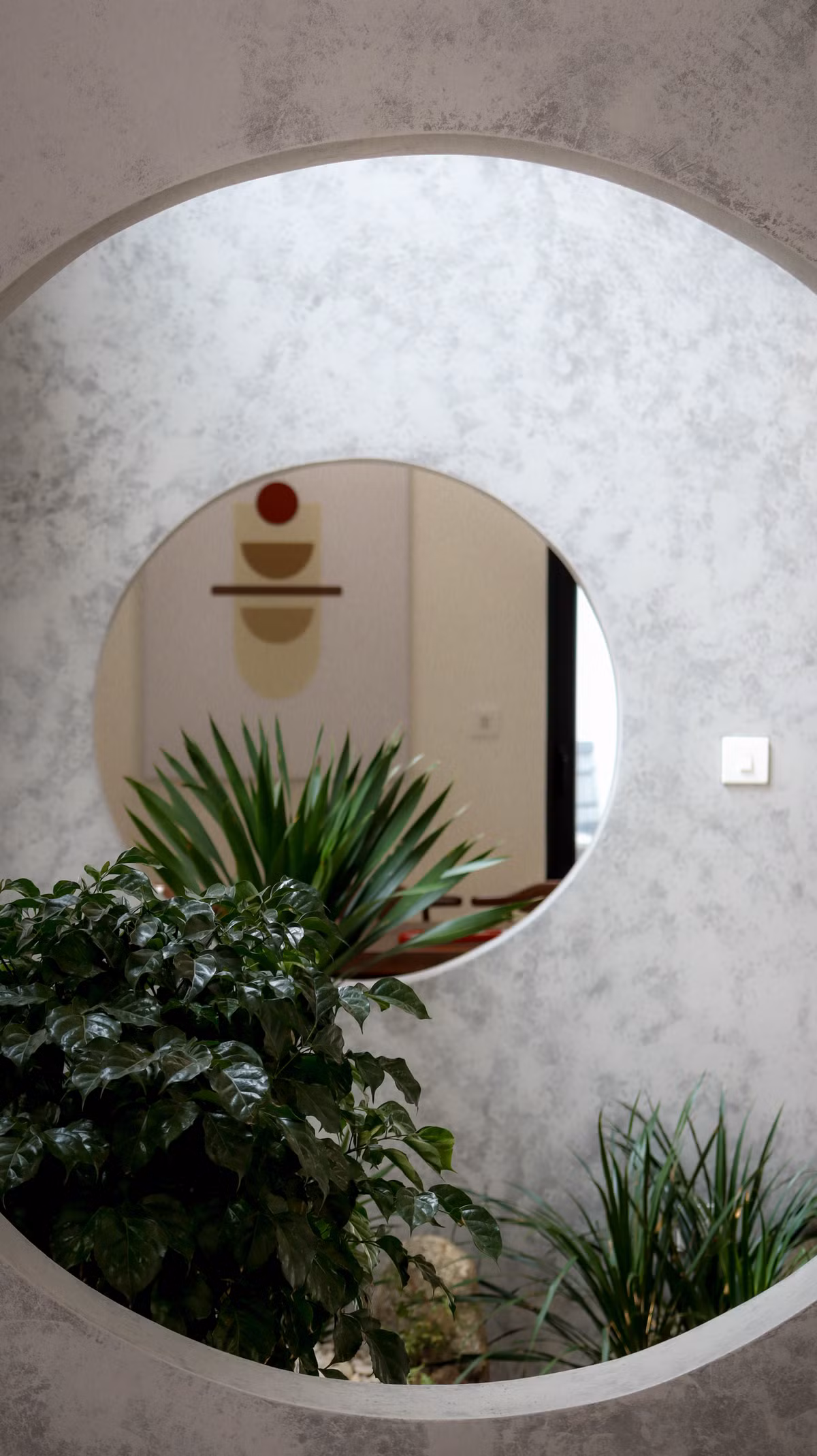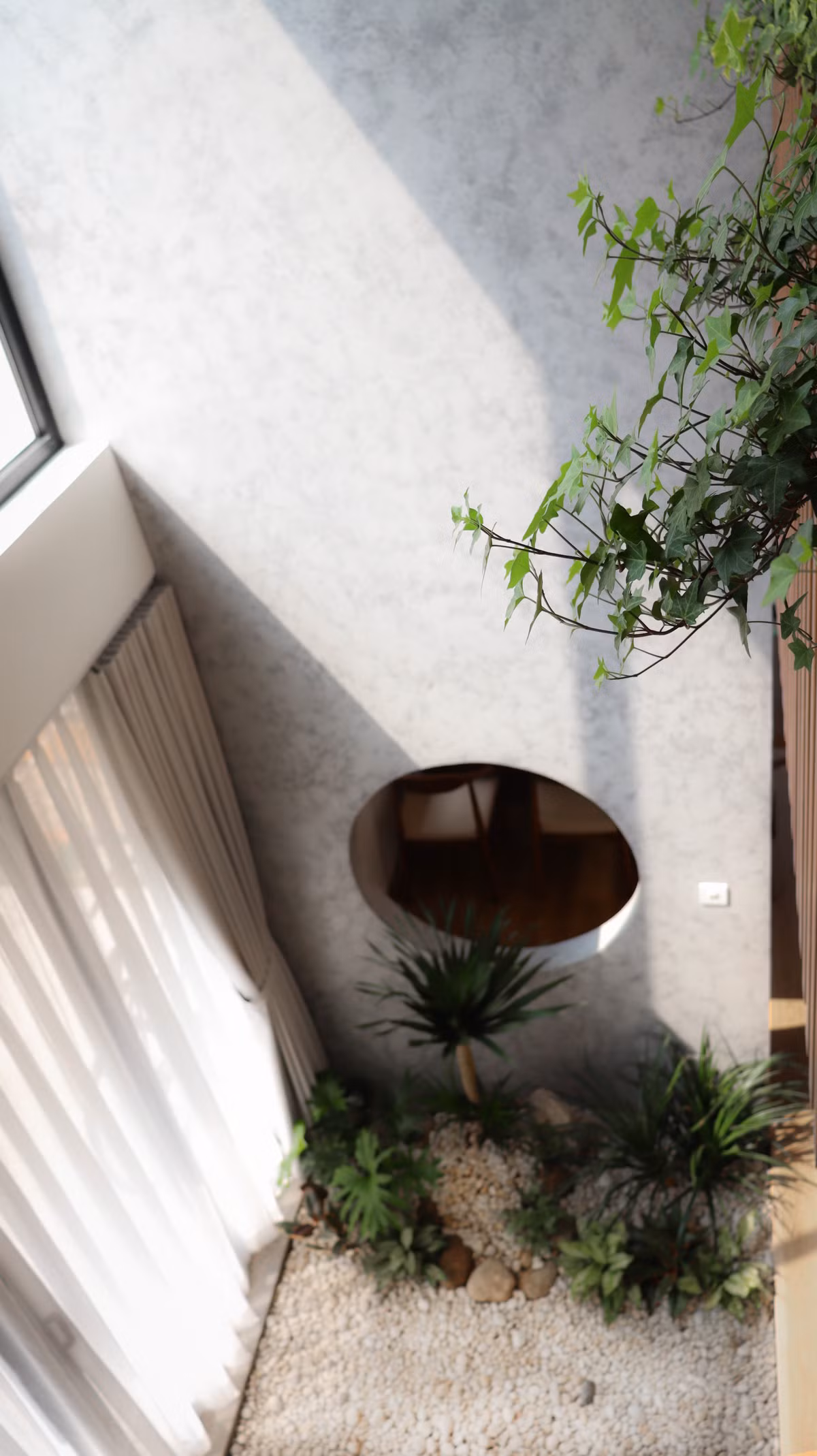 Hai ô tròn tại nơi thông tầng giúp thông gió và tạo điểm nhấn nho nhỏ.