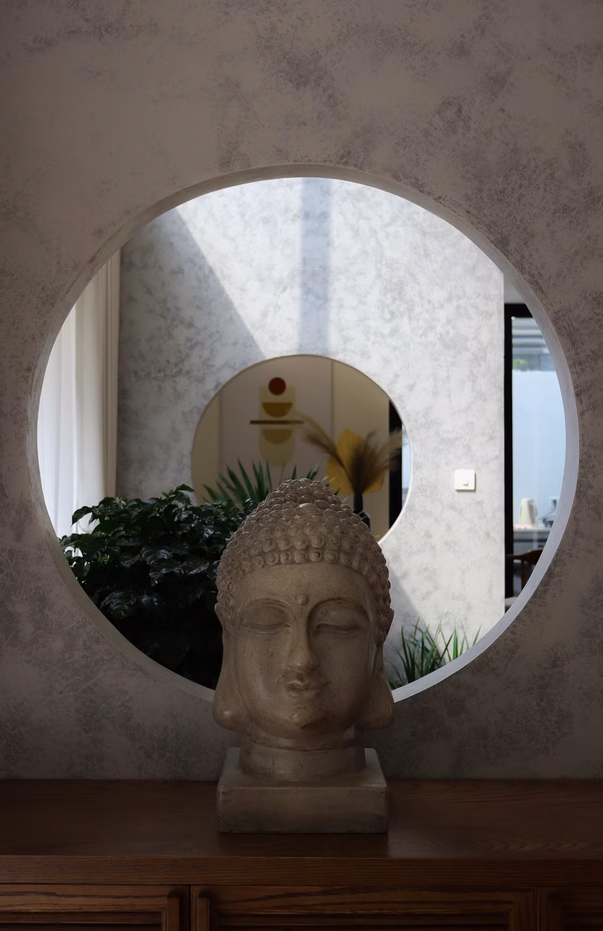Tượng Phật được đặt ô cửa tròn, tăng tính thẩm mỹ cho nhà.