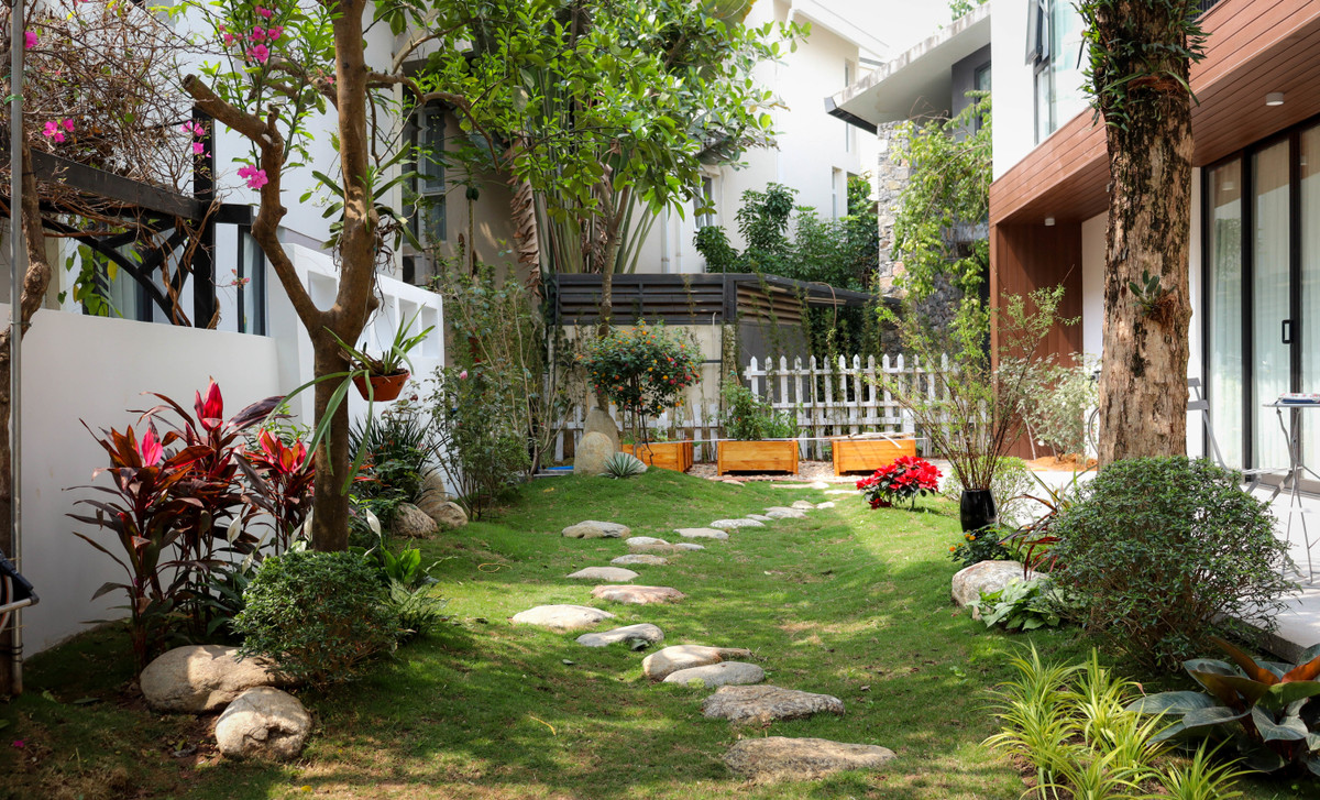 Nền vườn mini trải sỏi trắng, đá xanh mang chút phong cách Nhật Bản. Loại sỏi này khi bước lên bằng chân trần có tác dụng mát-xa, điều hòa cơ thể.