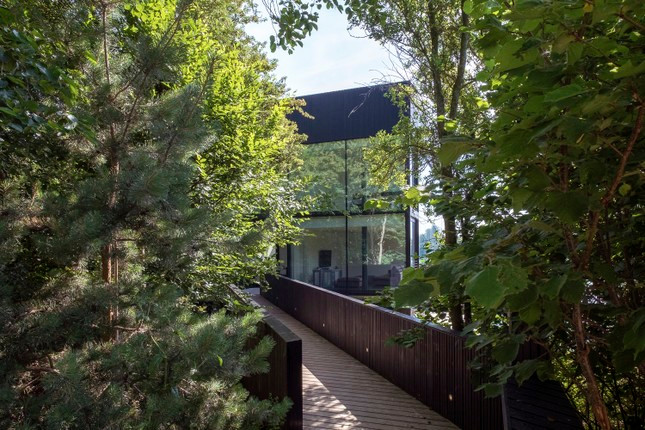 Vào những ngày đẹp trời có thể thấy rõ mây nước và bóng khu rừng in trên các ô kính của căn biệt thự, đưa kiến trúc hòa làm một cùng cảnh quan.