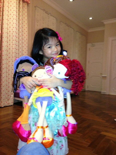 Cô bé có rất nhiều đồ chơi như búp bê và thú nhồi bông.