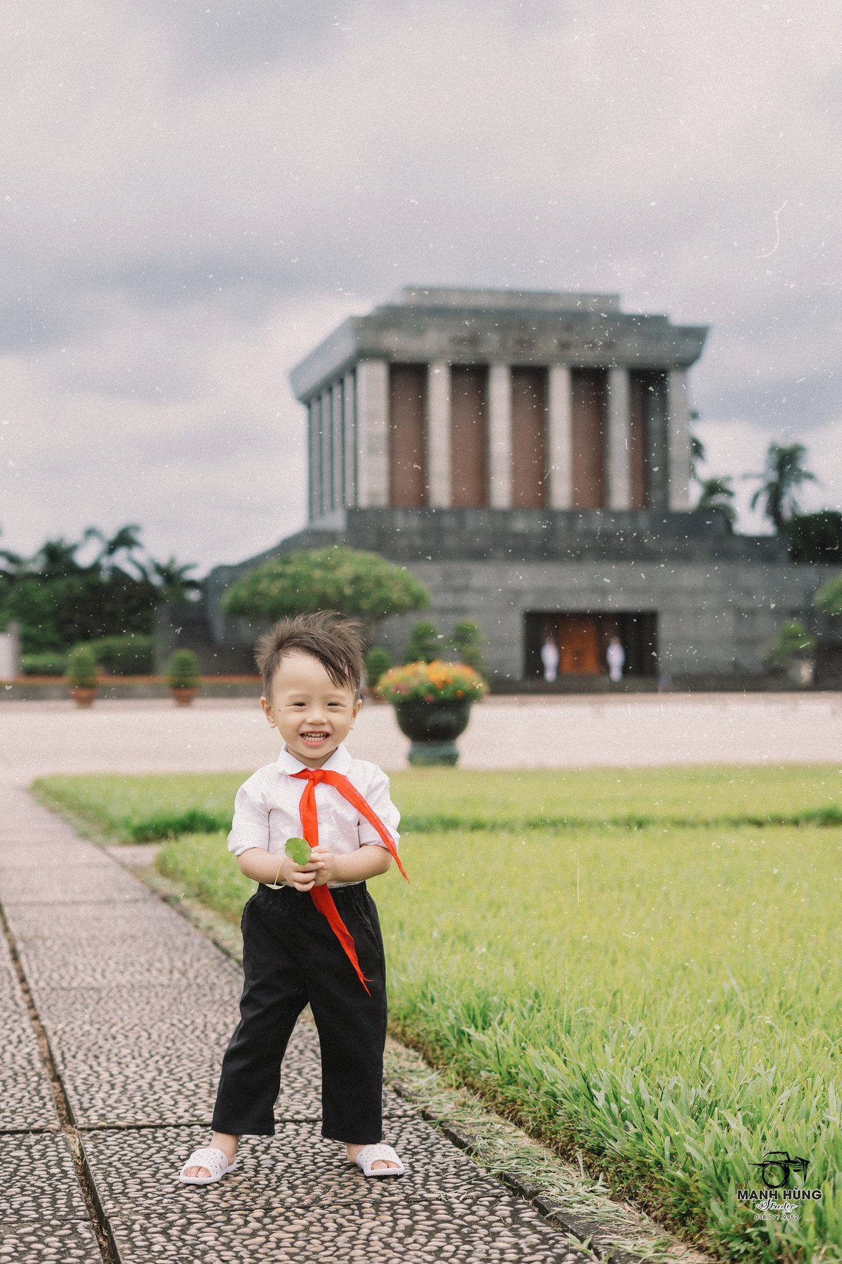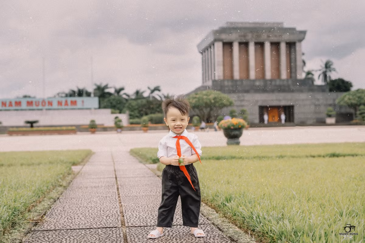 "Hai lần trước đi hụt, đến lần thứ ba cả nhà mới vào được để thăm Lăng Bác Hồ, lại gần 2/9 nên bố mẹ con chụp cho con bộ ảnh kỷ niệm chào mừng Quốc khánh", chị Hương Trần chia sẻ.