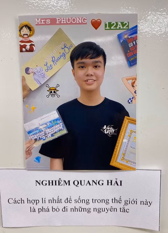 Trong bộ ảnh kỷ yếu của mình, mỗi thành viên lớp 12A2 đứng ở 1 background tường trắng, xung quanh là loạt phụ kiện chuẩn fan Kpop như lighstick, gấu bông, stiker... và đặc biệt là dòng chú thích cực bá đạo.