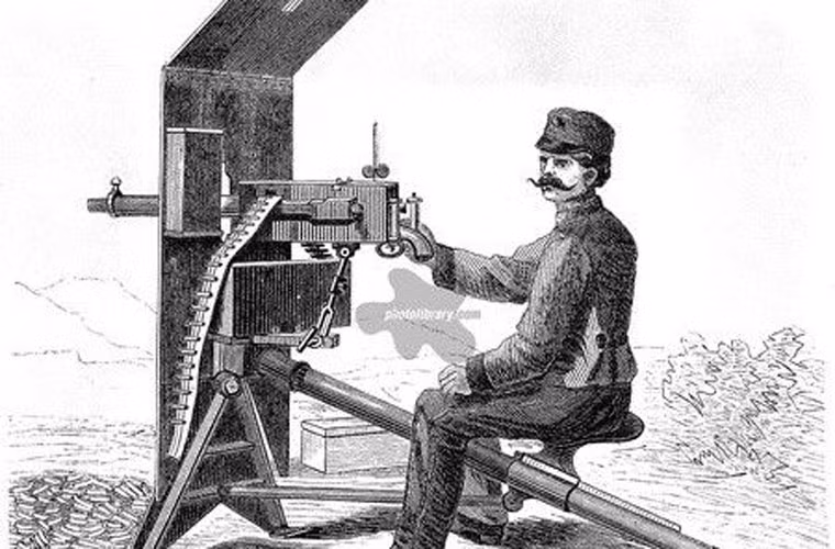 Trong hình là súng máy 5 nòng Gardner của Mỹ năm 1885, phần băng đạn nằm ở phía trên, việc nạp đạn vào nòng có lẽ phải nhờ tay quay.