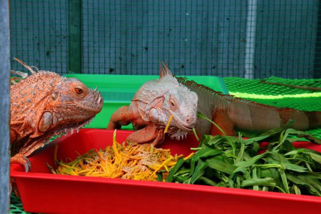 Về thức ăn, rồng Nam Mỹ là loài ăn chay, thức ăn của chúng thường là rau củ, phải rửa sạch và cắt nhỏ. Theo anh Đạt, ngoài ánh sáng, nhiệt độ và chủng loại, thức ăn cũng là yếu tố ảnh hưởng đến sắc tố trên da của rồng Nam Mỹ.
