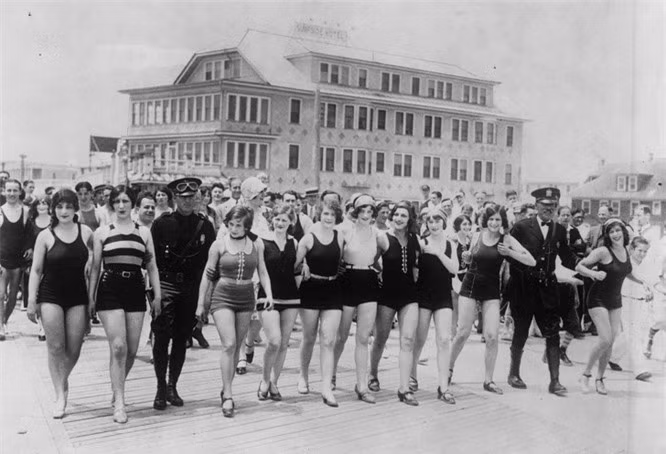 Một thế kỉ trước, luật pháp và lực lượng trật tự không chỉ truy bắt tội phạm mà còn đuổi theo những phụ nữ mặc đồ bơi “không đứng đắn” trên bãi biển. Tuy nhiên nhìn bức ảnh này, có vẻ như những cô gái này không hề sợ cảnh sát. Nhiều người tự hỏi rằng liệu các viên cảnh sát này sẽ cảm thấy thế nào nếu thấy phụ nữ mặc bikini hiện đại?