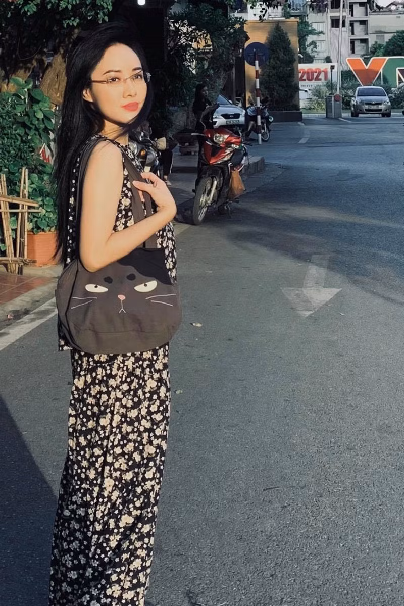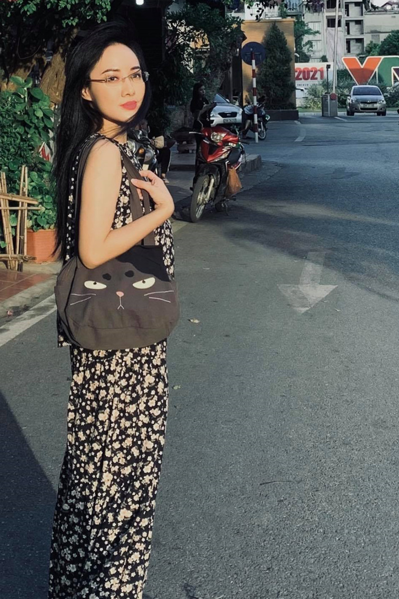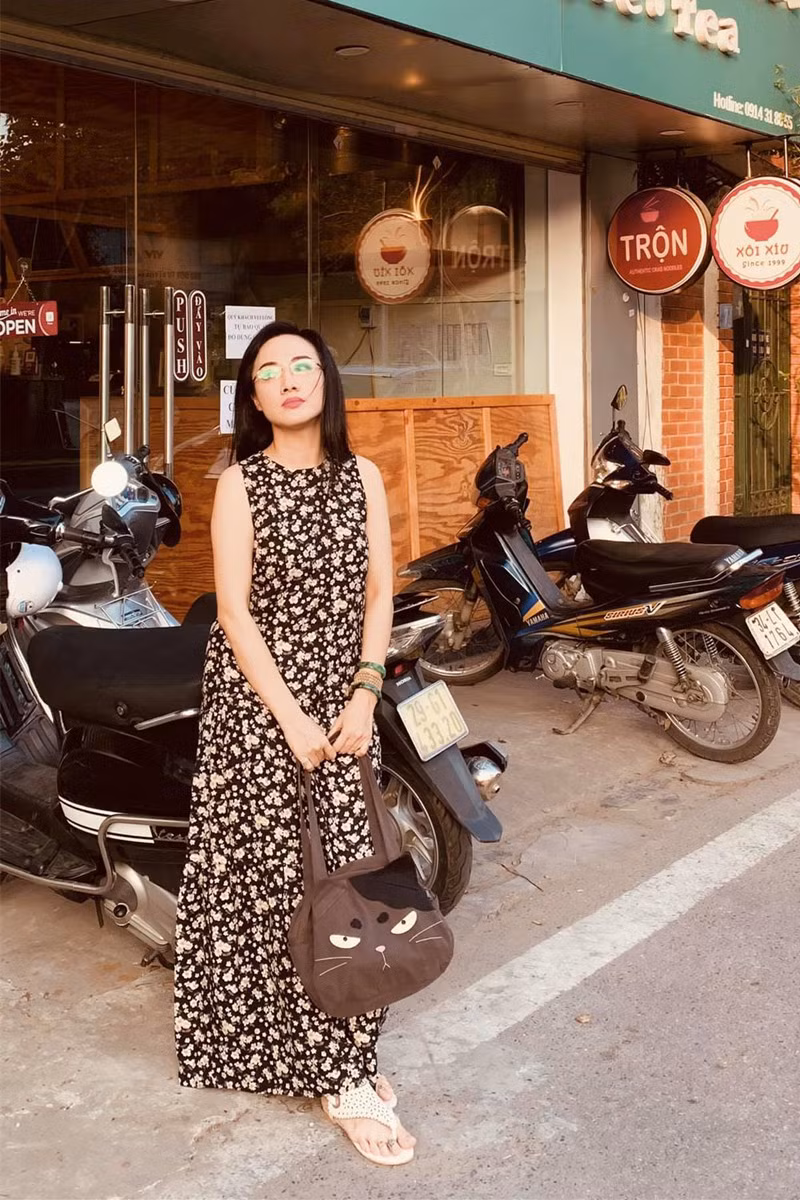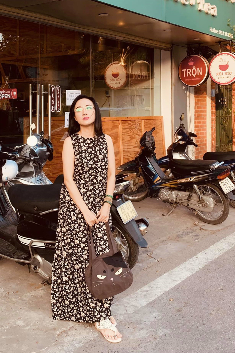 BTV Hoài Anh tạo dáng ở góc phố quen với váy hoa thoải mái cùng chiếc túi con mèo ngộ nghĩnh. Một người bạn trêu: "Có túi nào sang sang hơn chút không chị?", cô hóm hỉnh đáp: "Sang nhất rồi".