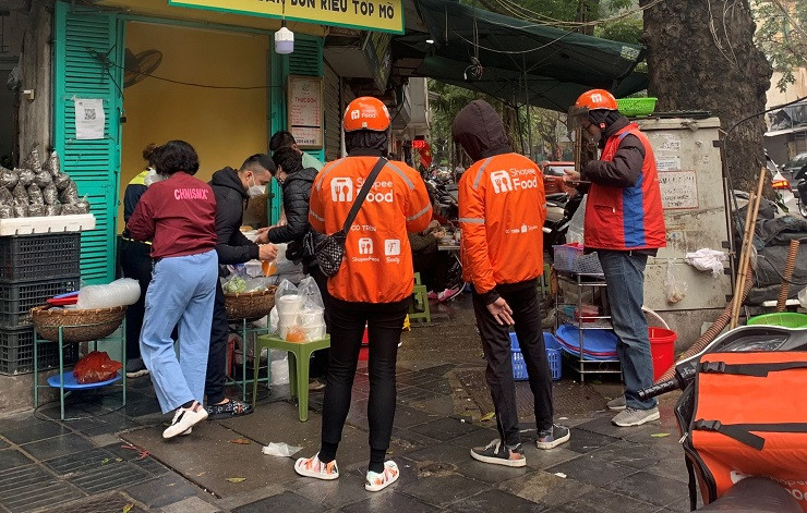 Ngoài hàng trăm khách ăn tại chỗ còn có rất đông shipper đứng chờ mua bún mang về cho khách.