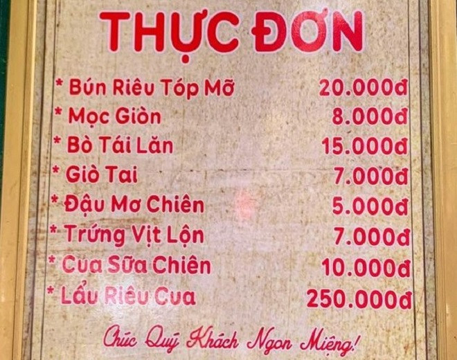 Thực đơn bún riêu tóp mỡ và các món ăn đi kèm.