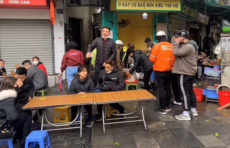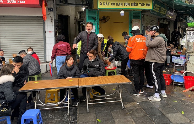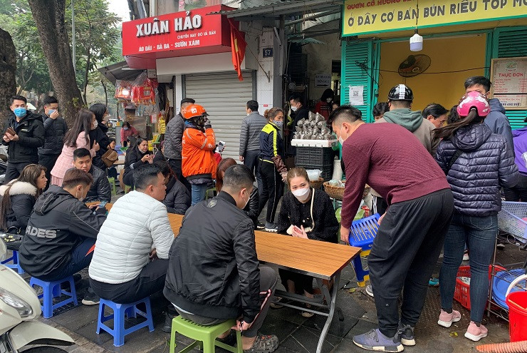 Những ngày đầu năm, hàng trămkhách đến ăn bún riêu tóp mỡ xếp hàng dài, chật kín ở những chiếc bàn kê tạm la liệt vỉa hè. Chủ quán bún này cho biết, ngày cao điểm, từ 6 giờ sáng đến 9 giờ tối, quán phục vụ hàng nghìn bát bún và có khoảng 16 người phục vụ hàng ngày.