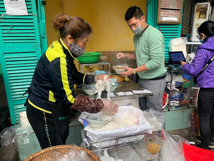 Đến quán này bất kỳ thời gian nào, từ sáng, trưa hay tối đều có thể thấy hàng trăm người với những bát bún nóng hổi, thơm phức trước mặt, chưa kể hàng dài shipper đứng chờ mua mang đi phục vụ khách online.