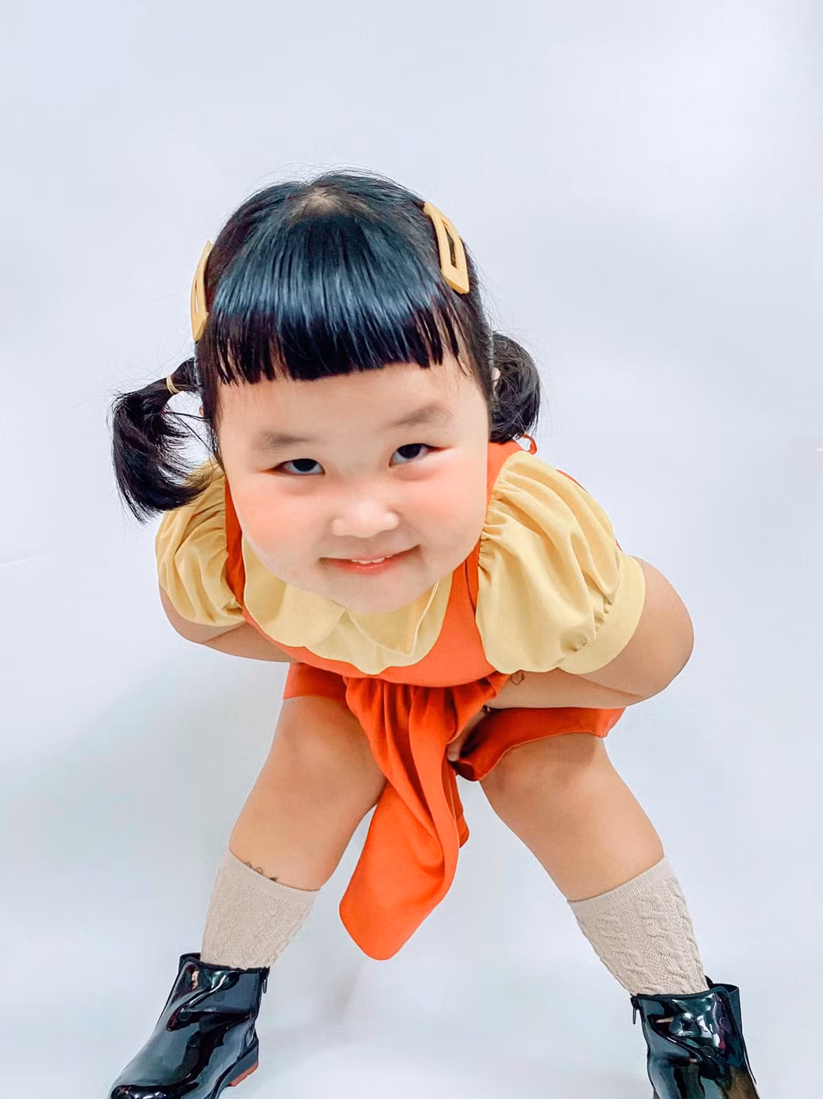 Cô bé khoác trên mình bộ váy màu cam cùng đôi giày đen và hai bím tóc xinh xắn y hệt như phiên bản gốc.