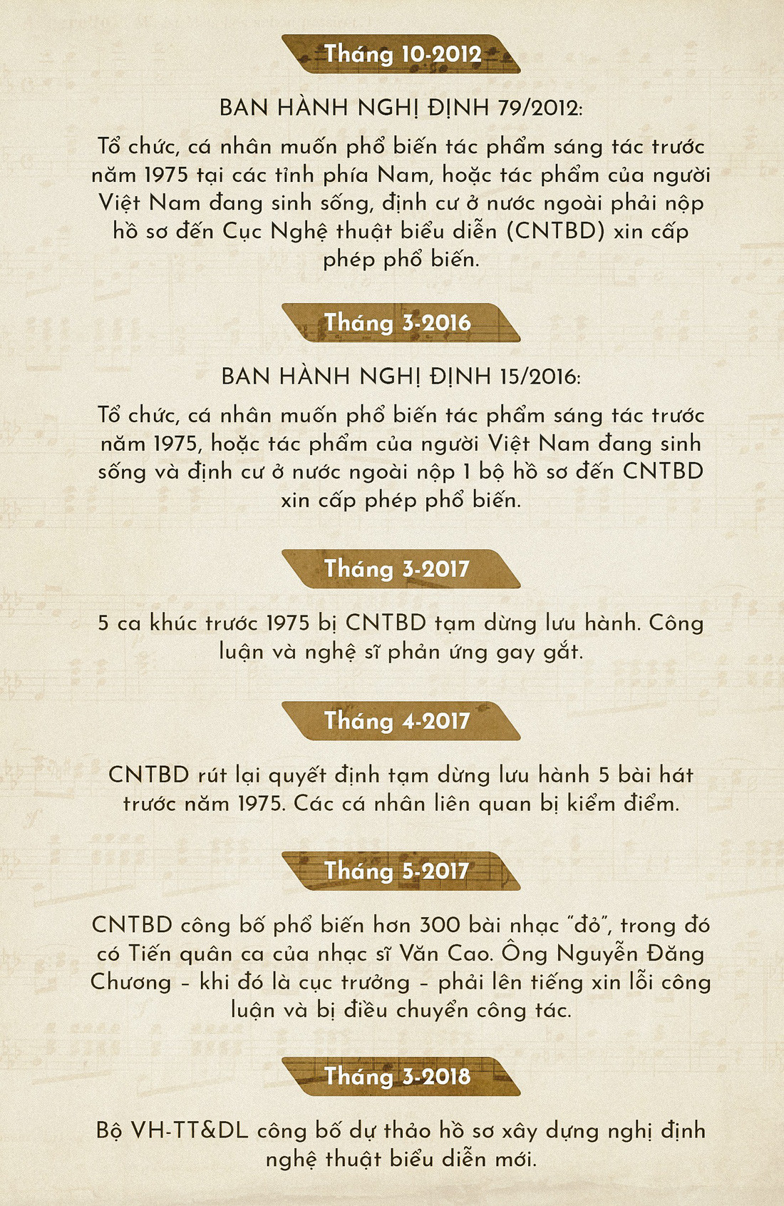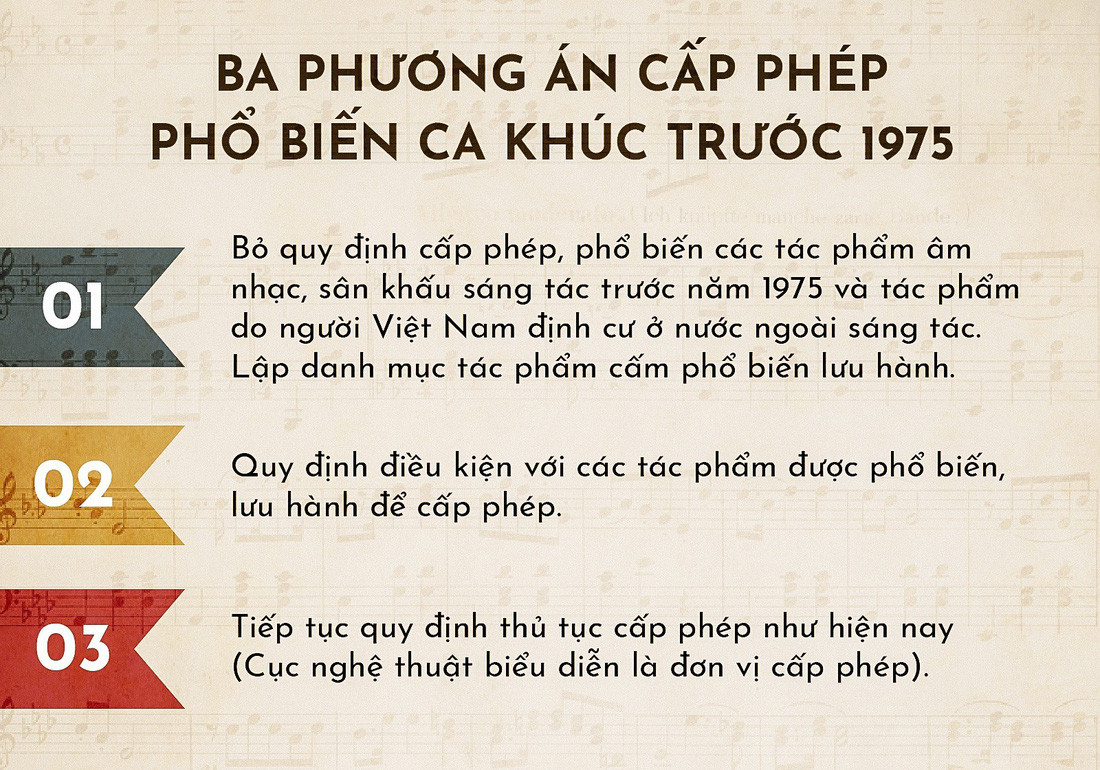 Thời gian qua nảy sinh một số vấn đề phức tạp đối với công tác quản lý trong hoạt động này. Vì vậy, Bộ Văn hóa - thể thao và du lịch đề xuất ba phương án sửa đổi quy định cấp phép bài hát trước năm 1975.