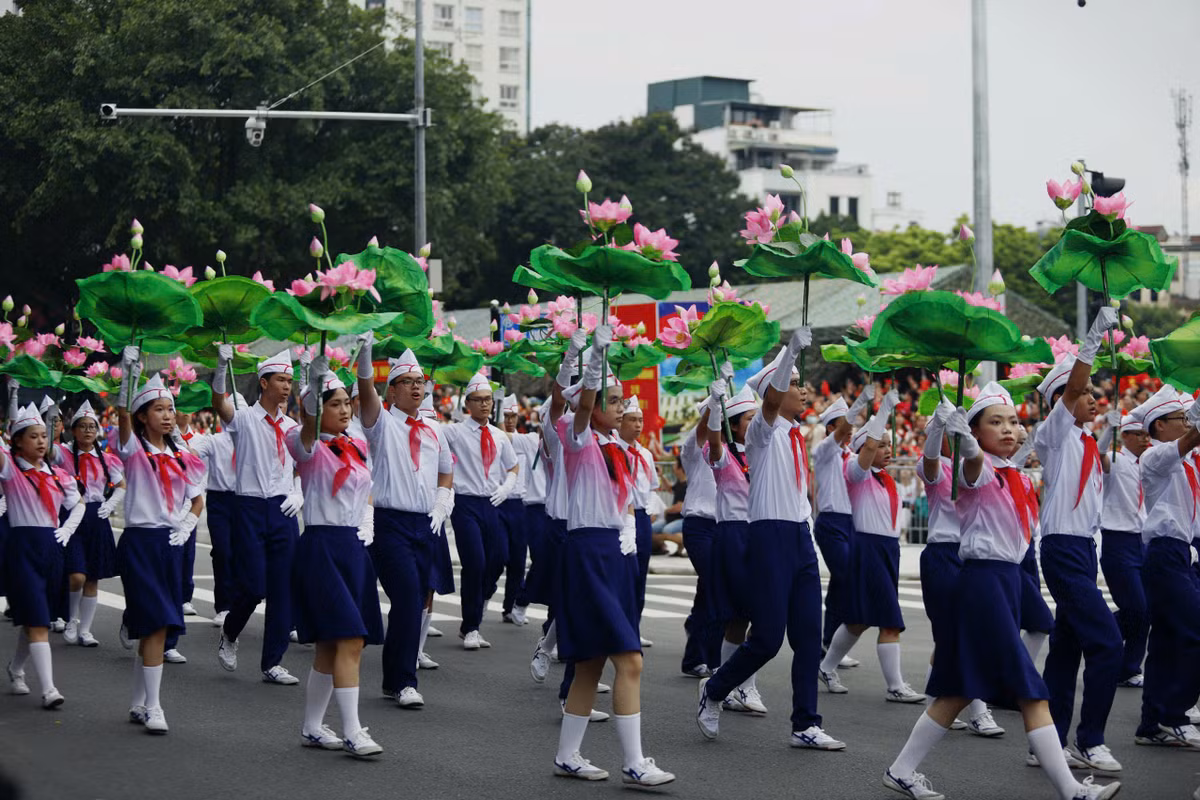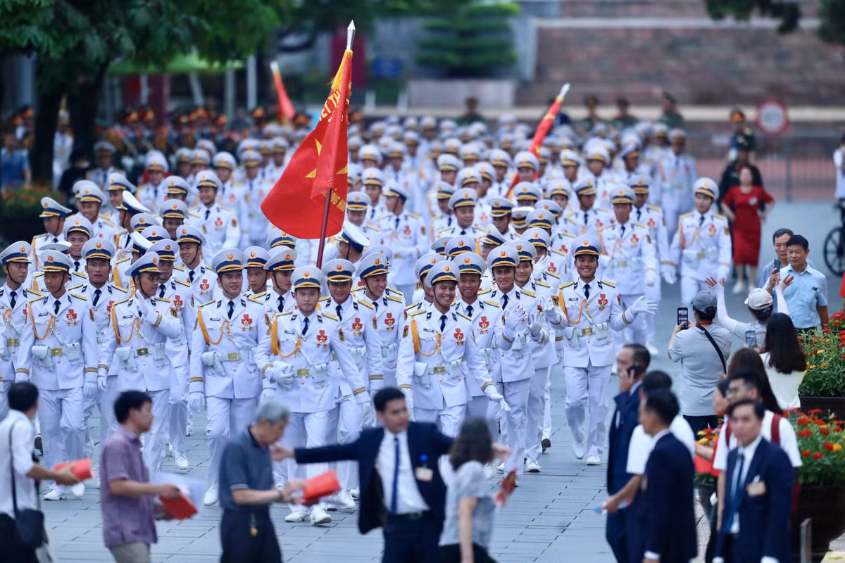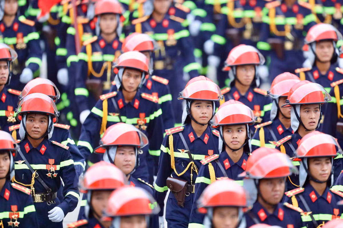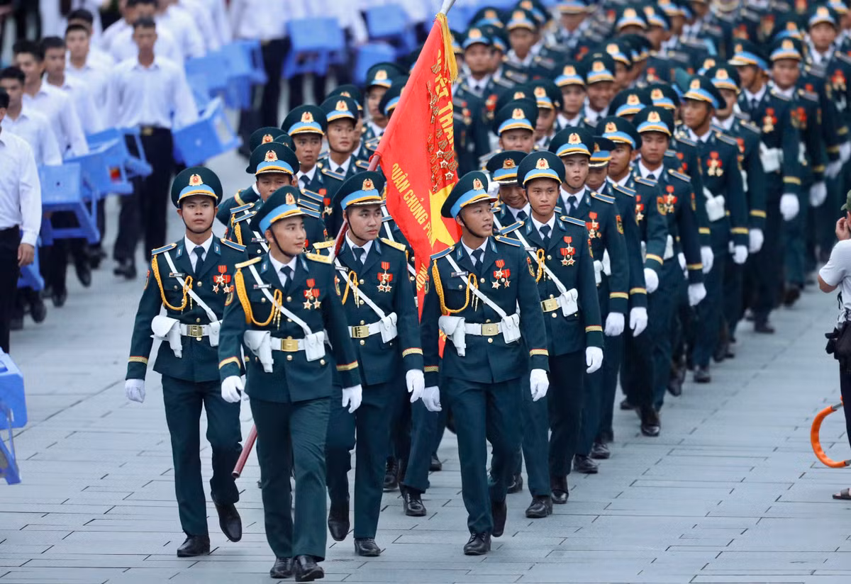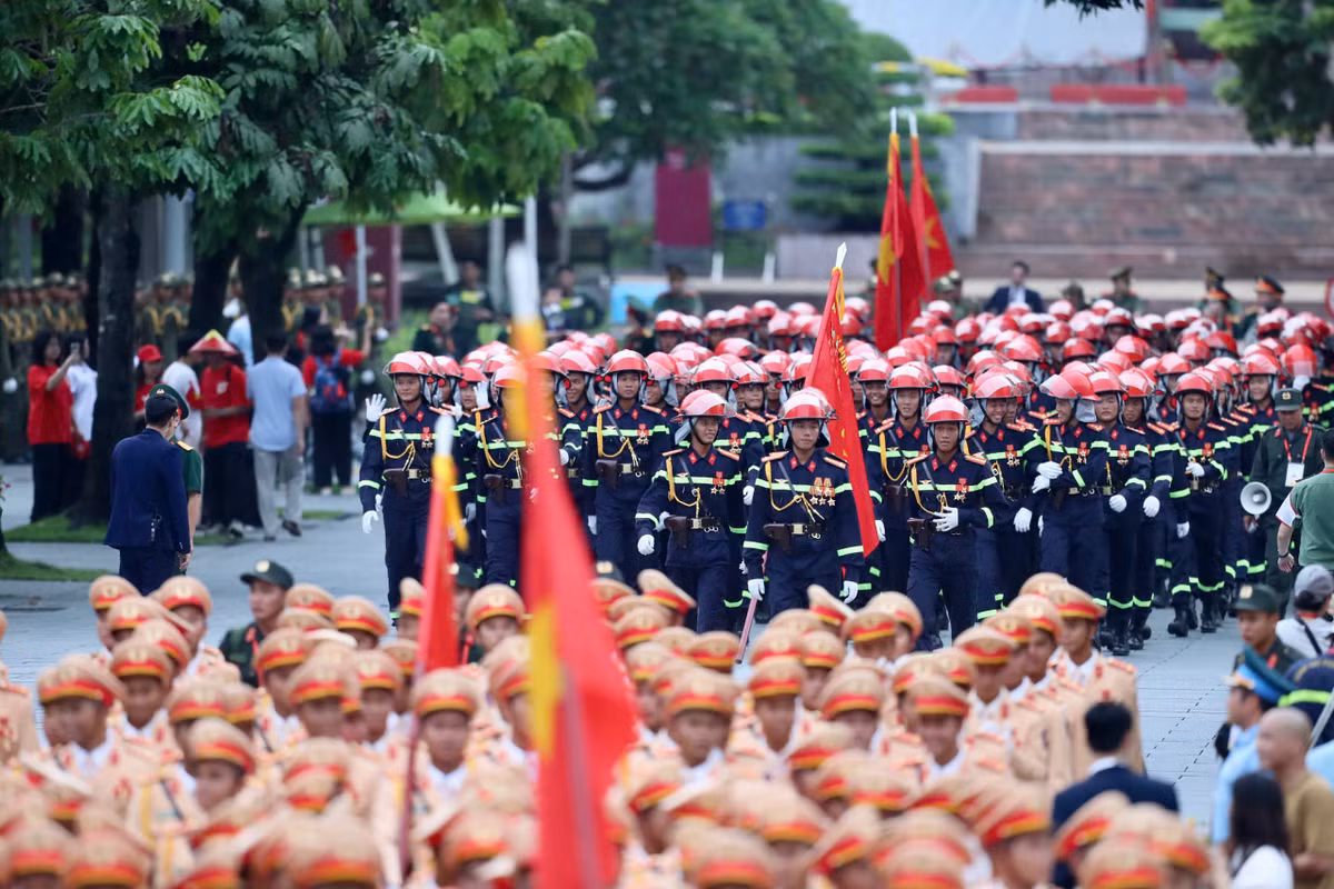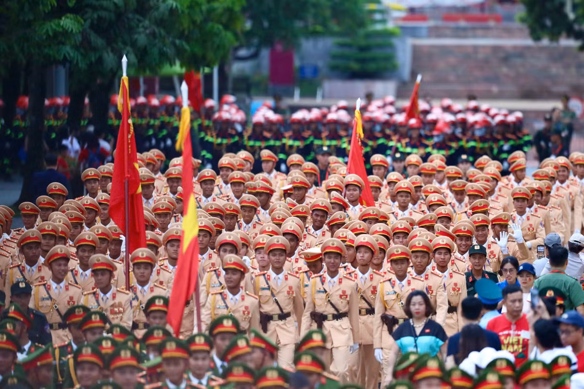 Trong tiếng nhạc rộn ràng, bước chân dứt khoát và hàng ngũ chỉnh tề của các đoàn đại biểu, lực lượng diễu binh tạo nên khí thế trang nghiêm đầy niềm tự hào.