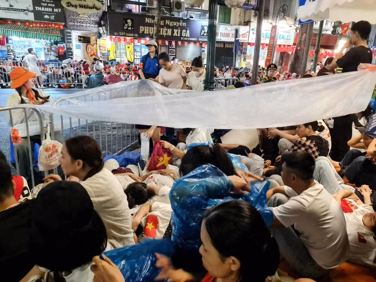 2h40: Sân vận động Mỹ Đình xuất hiện mưa nhỏ. Người dân đội mưa chờ đoàn xe xuất phát.