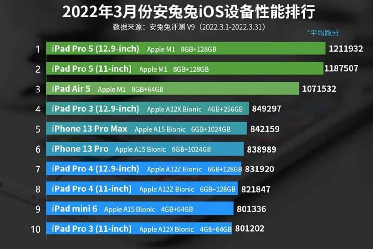 Danh sách cho thấy phiên bản chip M1 thế hệ mới nhất của iPad Pro tiếp tục dẫn đầu, với điểm số của iPad Pro 5 (12,9 inch) là 1.211.932, trong khi iPad Pro 5 (11 inch) là 1.187.507. Nếu cảm thấy màn hình 12,9 inch là quá lớn, người dùng có thể chọn phiên bản 11 inch vốn cũng mạnh mẽ không kém.