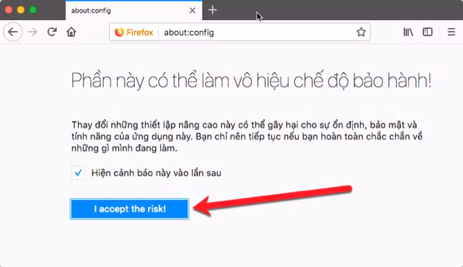 Trước hết, nhập đường dẫn about:config vào thanh địa chỉ rồi nhấn Enter, tiếp theo chọn I accept the risk! để tiếp tục.