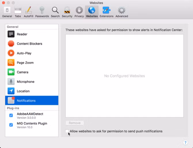 Cửa sổ mới hiện ra, nhấn tab Websites rồi chọn Notifications. Phía dưới cột bên phải có tùy chọn Allow websites to ask for permission to send push notifications, chỉ cần bỏ chọn hộp này là xong.