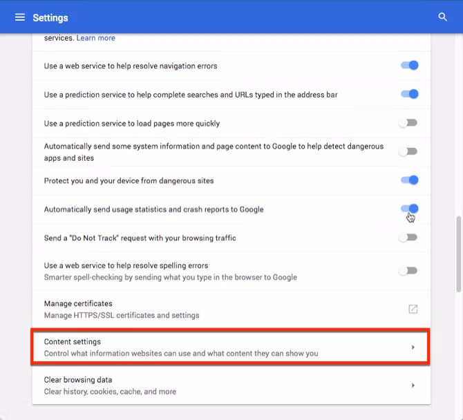 Trong trang Settings, kéo xuống dưới chọn Advanced -> Content Settings.