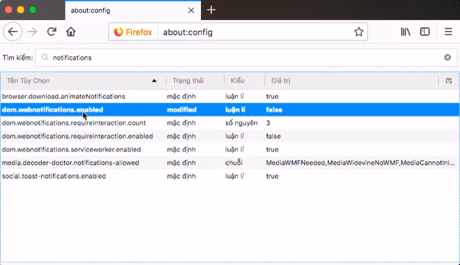 Tại ô tìm kiếm đầu trang, nhập notifications, sau đó nháy đúp chuột vào mục dom.webnotifications.enabled để chuyển giá trị (value) từ true sang false.