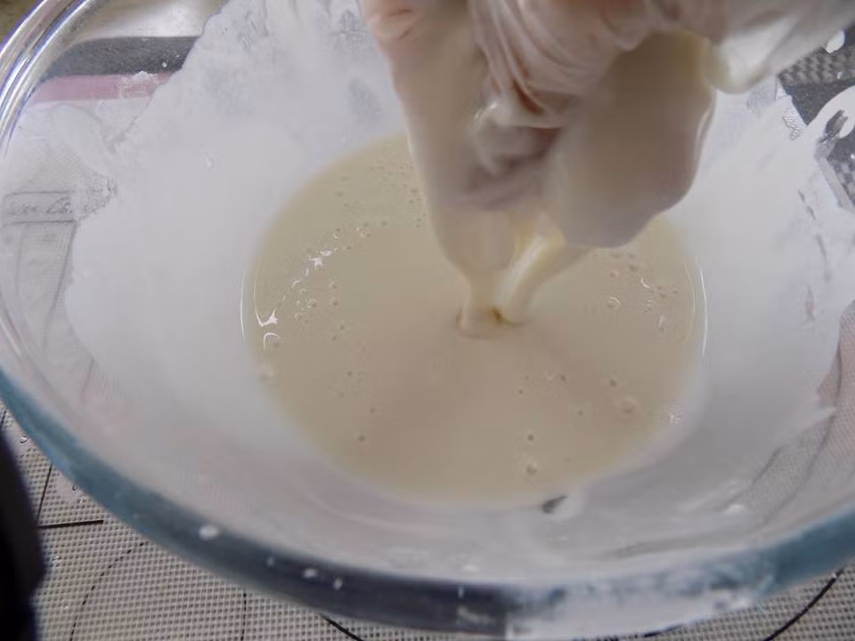 Bước 1: Bột gạo + bột năng+ men + muối + đường và bột nở cho vào âu trộn đều, sau đó cho gần 2/3 nước dừa tươi vào mang bao tay nhồi 10 phút (nhồi càng lâu rễ bánh càng nhiều). Sau đó, cho hết phần nước dừa tuơi còn lại và nước cộ dừavào nhồi chung. Bọc màn thực phẩm ủ 3 -4 tiếng hoặc lâu hơn . Khi bột sủi tăm (giống như sữa chua bị hư) là được.
