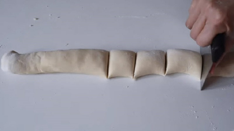 Cắt khúc khối bột này thành 8 miếng bằng nhau. Kéo từng miếng bột ở các đầu hở tại từng khúc bột sau khi cắt và đặt chúng lên nhau rồi vặn bột chặt lại để mỡ lợn không bị chảy ra ngoài.