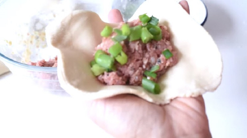 Cán phẳng từng miếng bột thành những hình tròn có đường kính khoảng 6cm inch và giữ mỏng xung quanh các cạnh. Sau đó cho từng phần nhân thịt vào chính giữa miếng bột. Bọc nhân bánh bằng cách véo các mép bột lại với nhau giống như cách làm bánh bao. Lặp lại quy trình với các miếng bột còn lại sao cho hoàn thiện 8 khối bột bánh hoàn chỉnh.