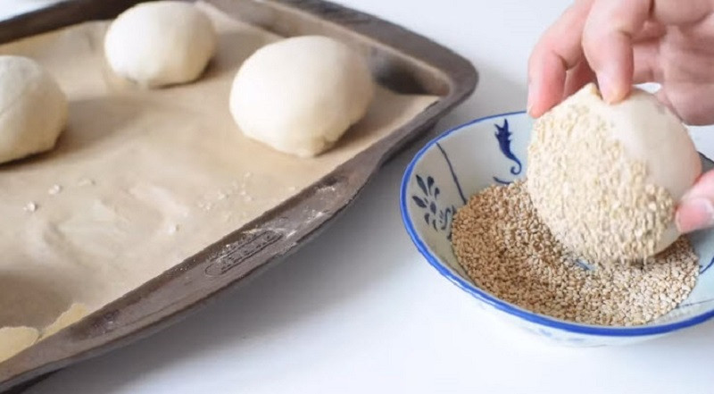 - Túm tròn từng khối bột lại giống như làm bánh bao, rồi lăn chúng qua một lớp mè trắng.