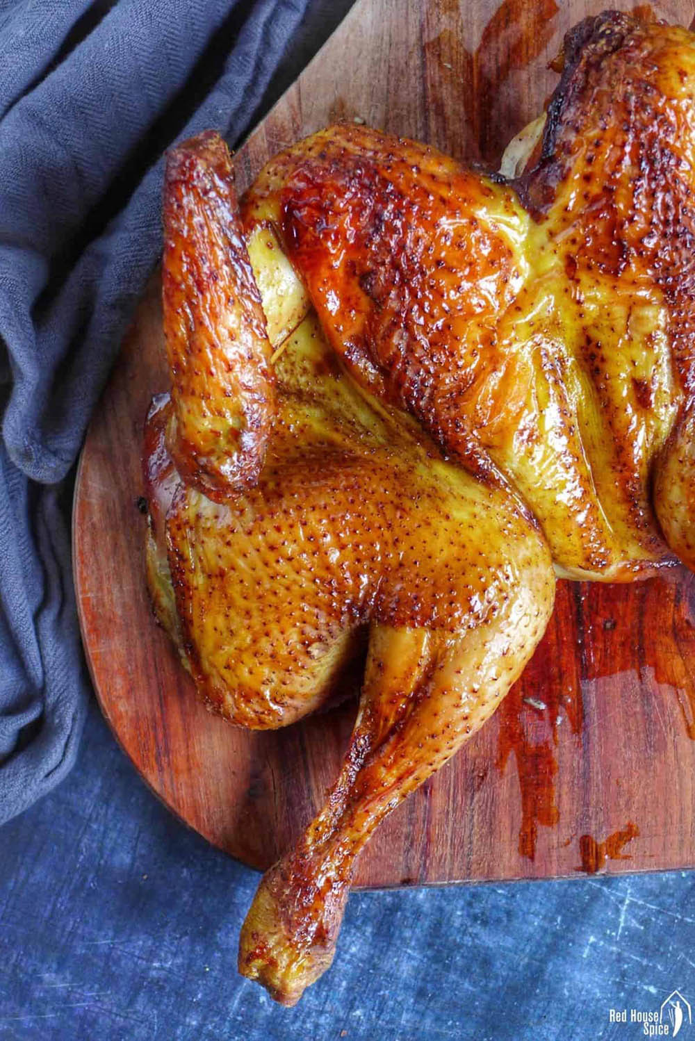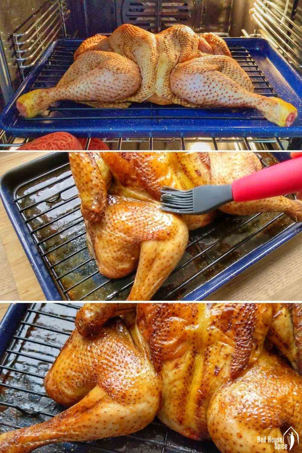 Lấy gà ra ngoài, trộn mật ong với nước tương đen, phết một lớp mỏng lên da, cho lại vào lò nướng, nướng thêm 5 phút. Vặn nhiệt độ lên 220 độ C, lấy gà ra lần 2, phết mật ong, nướng thêm 5 phút nữa là xong. Lấy gà ra để yên trong 10 phút trước khi cắt thành những miếng nhỏ.