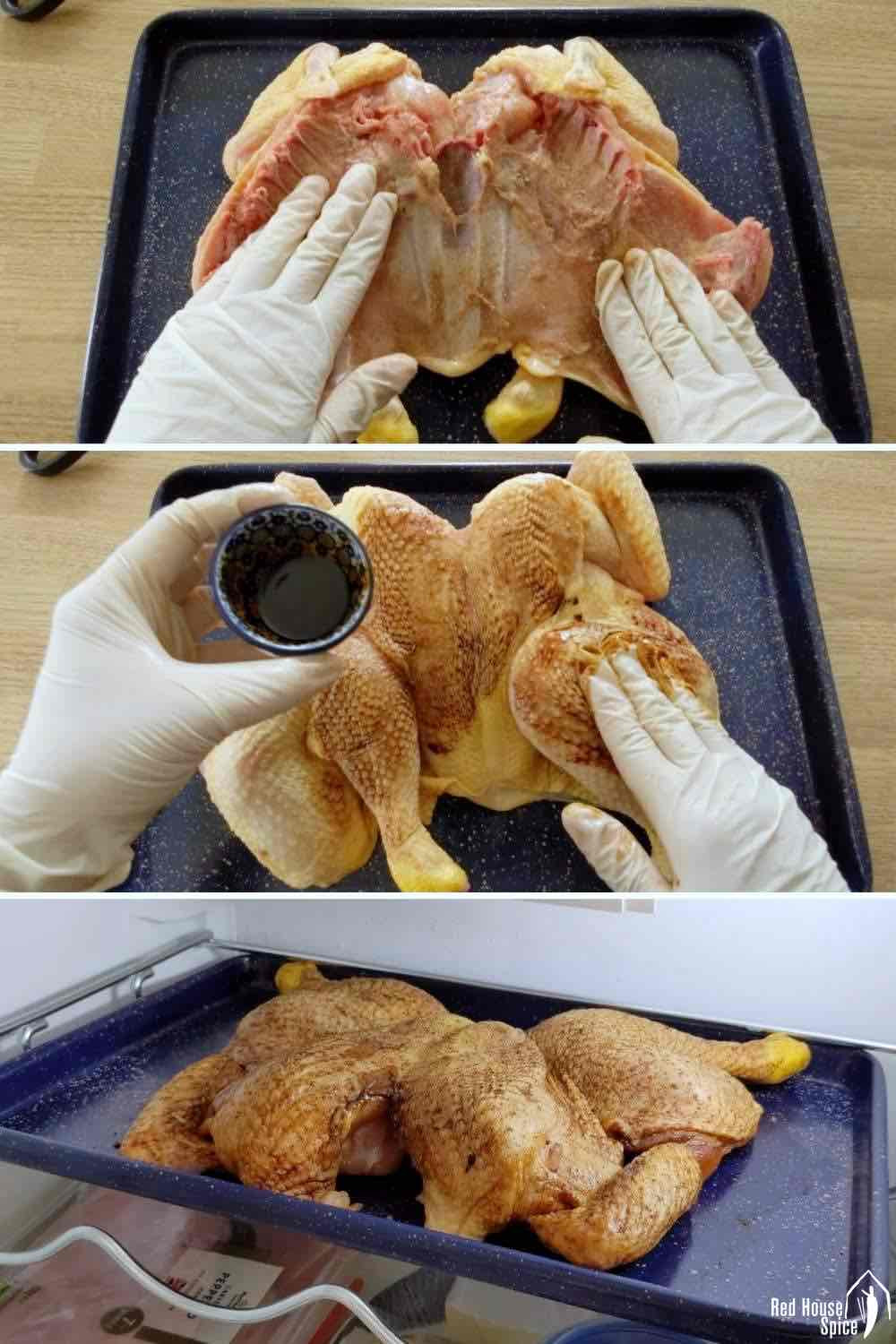 Lau khô toàn bộ con gà bằng giấy ăn để loại bỏ độ ẩm. Trộn muối, bột ngũ vị hương, bột tỏi và tiêu vào tô, dùng tay chà hỗn hợp khô bên trong gà.