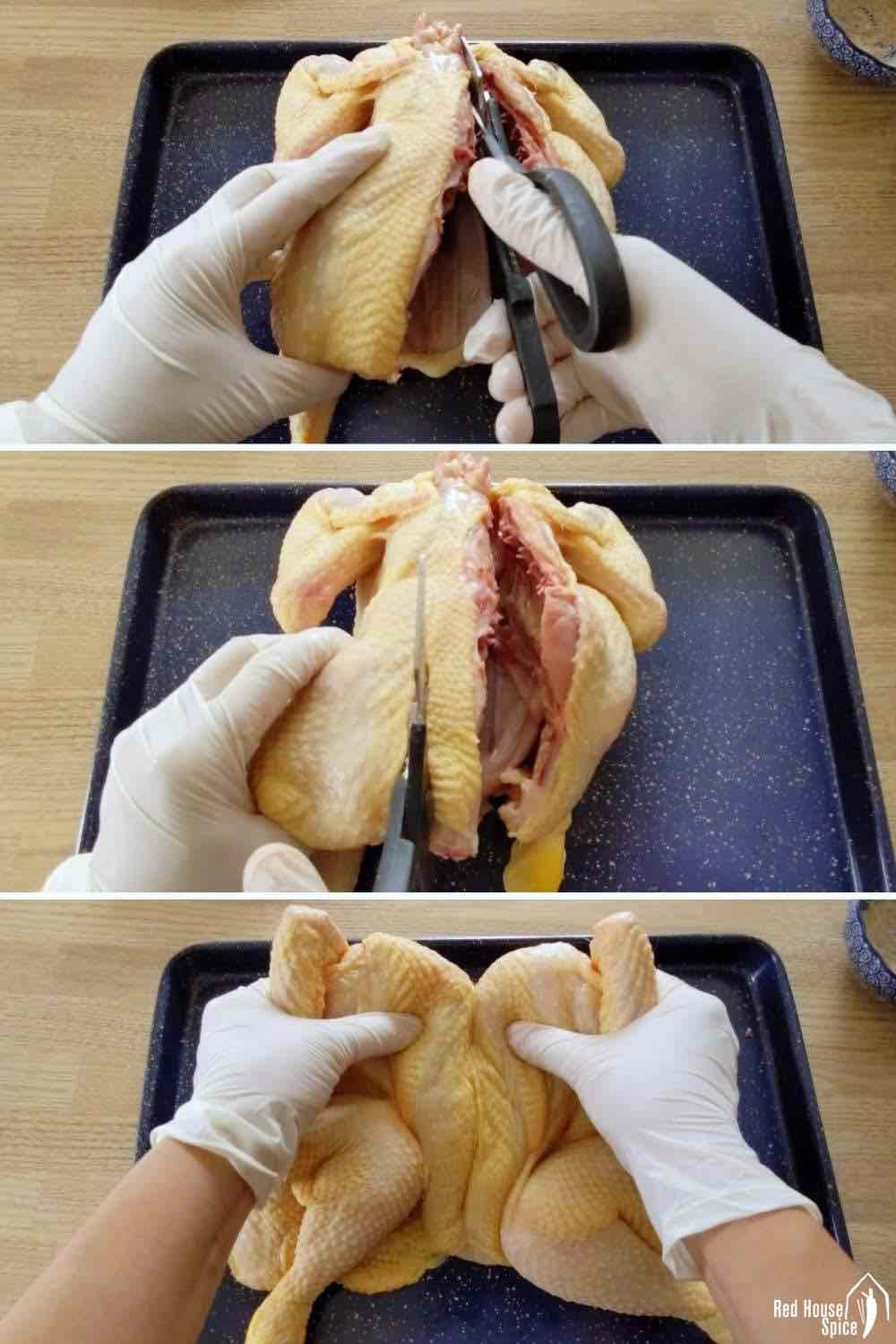 Đặt gà lên khay nướng, phần ức hướng xuống, chân hướng sang 2 bên. Tìm xương sống của nó ở giữa, dùng kéo nhà bếp cắt dọc 2 bên xương sống, tách ra như hình.