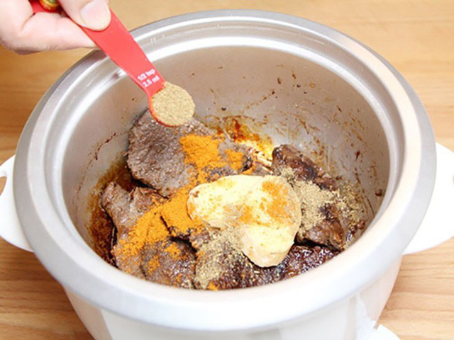 - Bước 3: Khi nào nút cook nhảy lên lại thì bạn lật thịt. Cho thêm gừng, bột ớt, bột thì là vào. Sau đó đem đảo đều lên cho đến khi nào thịt bò chín và khô hẳn là được.